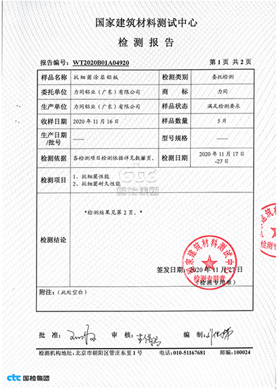 After scientific testing, Litong antibacterial color coated aluminum coil has achieved 99.99% antibacterial rate against 18 types of bacteria such as Staphylococcus aureus and Escherichia coli in daily life.